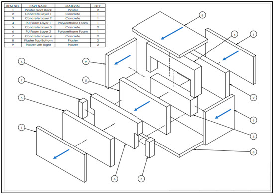 A simplified geometry of the assembly is shown in Figure 3. A 20 mm layer of plaster was applied on all six sides of the block. The breakdown of the design to convert into two-dimensional simplified geometry and its breakdown into smaller sections and the direction of heat flowing across it (represented by blue arrows) is shown in Figure 4.
