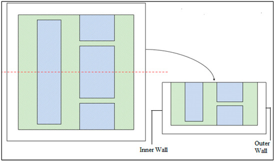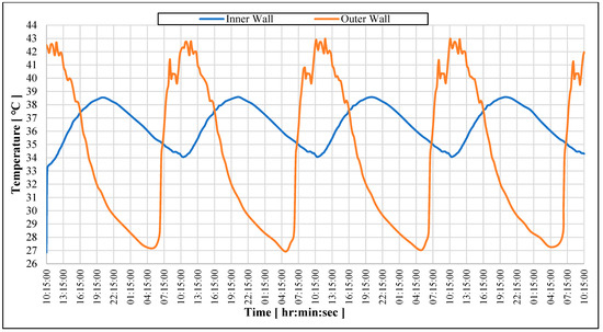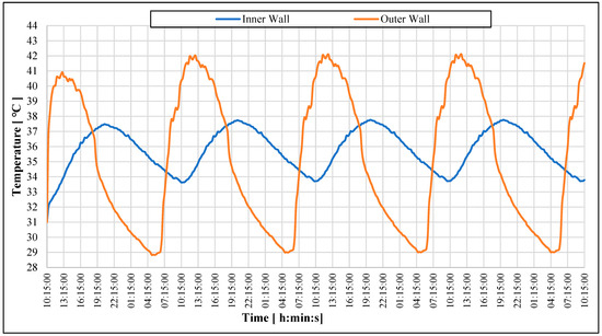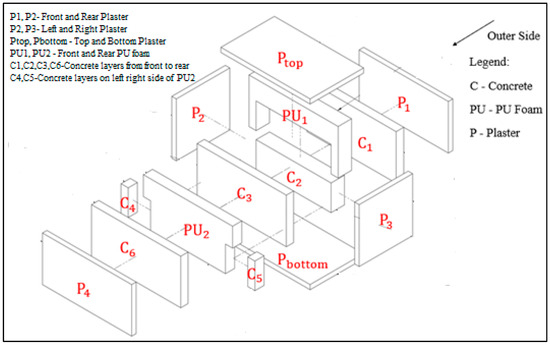 In [18], experimental measurements were obtained for individual masonry blocks under controlled environments and compared with a mathematical model to evaluate their thermal performance. The experimental results of a multi-layered wall system were compared with numerical ones in [19,20] with modeled data. However, since these studies were conducted in the lab under controlled conditions, it was still not clear how the performance of a block or a wall would be affected under realistic uncontrolled conditions. In [21], a small model room measuring 600 cm × 730 cm × 220 cm was built in an open environment using in situ method to study the performance of various building wall systems. Similarly, in [22], different models of wall systems using the in situ method were built. However, in [21,22], the measurements were noted after 24 h, and the analysis was based on the assumption that the system reaches a steady state within that time, which eventually reflects the real-time transient conditions. This clearly showcases a gap in this field.