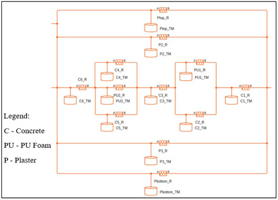 The Simulink model for the wall is presented in Figure 7. The thermal capacitance consisting of the thermal resistance (R) and thermal mass (TM) for each layer of the wall is clearly presented in this figure. The thermal resistance of each layer [34] is calculated using the Formula (6)