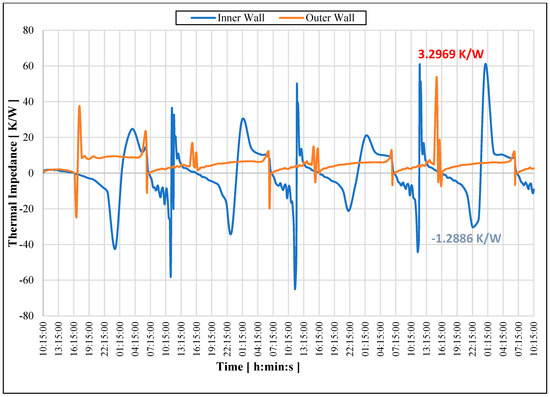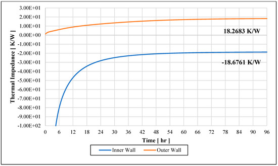 - In a steady-state system, the thermal impedance on the inner and outer wall surfaces gradually converges to a constant value at the end of four days. The reason for this is that after around 72 h, the wall becomes saturated and stops storing additional heat, thereby representing a controlled steady-state non-realistic condition.