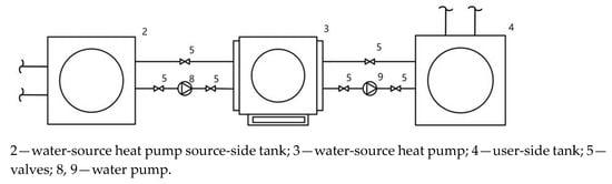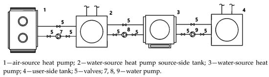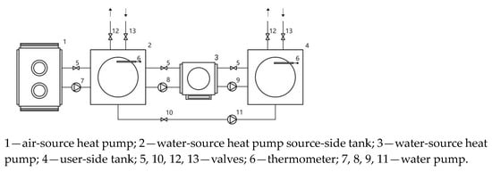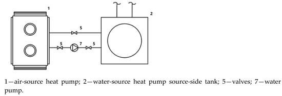 During the experiments in various heating periods, the source-side water was heated and its temperature maintained by the ASHP. Changes in the WSHP in other scenarios were recorded by altering the source-side water temperature. A schematic diagram of the experiment is presented in Figure 5.