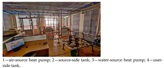 The ASHP, WSHP, and circulating pump models were selected according to the heat load requirements of the laboratory, and they are shown in Table 1 and Table 2. Table 3 shows the range, resolution, and precision of the experimental test equipment. The volume of the two hot water storage tanks with thermometers was 1 m3. As a high-precision digital display thermometer, a GJD-200LCD was selected. Figure 2 presents a diagram of the experimental platform, from left to right, the names of the equipment are mainly water-source heat pumps, air-source heat pumps, user-side tanks, source-side tanks.