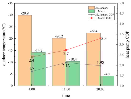 The initial temperature of the heat storage water was 15 °C. The experimental time frames were the middle heating period, with experiments conducted on 22 January 2022, and the end heating period, with experiments conducted on 1 March 2022, because the outdoor temperature difference between the early heating period and the end heating period was not significant. The start times for the experiments in the early (ending) heating period were 4:00 a.m., 11:00 a.m., and 8:00 p.m., and the ASHP was activated at these times. The heat storage water was heated to approximately 40 °C, and the working duration and COP1 of the heat pump were recorded. The work efficiency of the ASHP in different heating periods is presented in Table 4, and the heat pump COP1 change curve is shown in Figure 6.