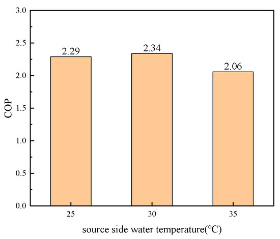 COP of system at different source-side water temperatures.