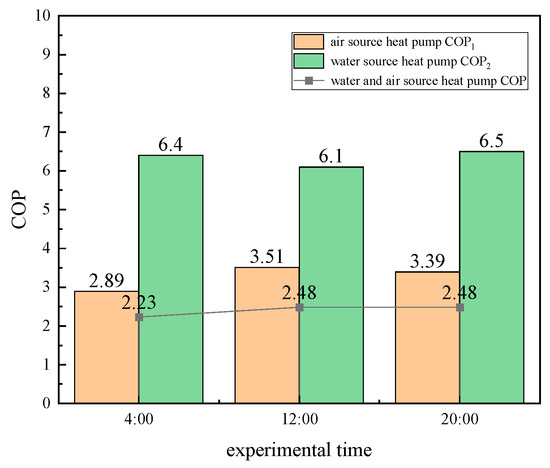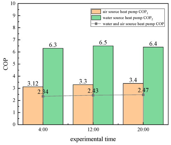 Next, the WSHP source-side water temperature was set to 35 °C to achieve a heat pump source-side water temperature greater than 30 °C. The experiment was conducted on March 6 at 8:00, 12:00, and 16:00. The above experiments were repeated, and the corresponding data were recorded. The experimental results are shown in Table 7.