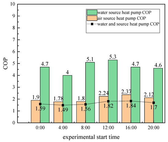 The purpose of this experiment was to verify the COP variation with the water temperature of the source-side water tank of the system in the combined heat storage and supply state. The experiment was conducted on 5th March and 6th March, 2022. Initially, the water temperature on the source side of the water-source heat pump was set to 15 °C, and the ASHP was employed for heating and maintaining at 25 °C. The experiment was conducted at 8:00, 12:00, and 16:00. When the system reached a temperature of 45 °C, it was halted, then the COPs of the ASHP and WSHP were recorded, and the comprehensive COP of the system was calculated. The experimental data are shown in Table 6.