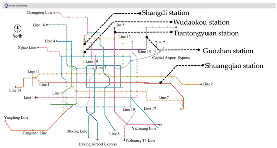 As of July 2024, the Beijing metro system consists of 27 operating rail transit lines, including 5 lines with entirely above-ground stations and 12 lines with partially above-ground stations. This study selected five above-ground stations, namely Tiantongyuan Station on Line 5, Wudaokou Station and Shangdi Station on Line 13, Guozhan Station on Line 15, and Shuangqiao Station on the Batong Line, as research subjects based on factors such as skylight form, side windows, and section form (Figure 1). Thermal comfort questionnaires for passengers were conducted, and on-site measurements of temperature, humidity, and wind speed in stations were measured from 10 to 17 July 2024. All construction-related factors for the five stations are listed in Table 1.