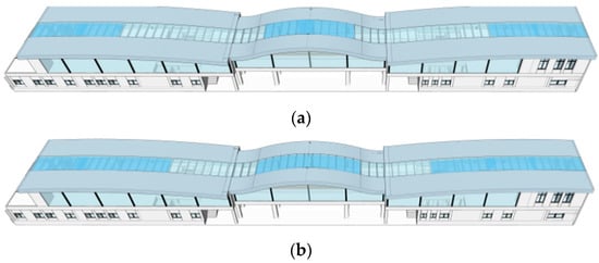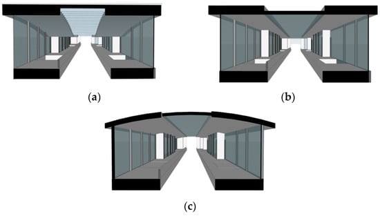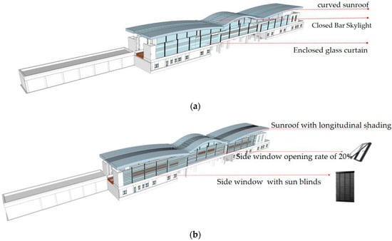 Strong solar radiation is a major contributor to the poor thermal environment in above-ground stations during the summer. Wudaokou Station’s platform features a long, longitudinal skylight that cannot be opened. The main considerations in platform skylight design include the skylight opening mode, opening rate, and sunshade design. Using the original 960 m2 of skylight area as a benchmark, the ratios of the openable skylight area were set to 40% and 60% of the original area, respectively (Figure 2).