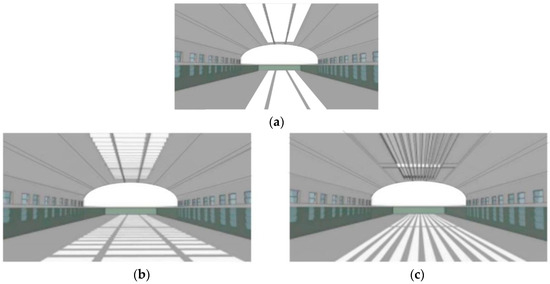 In the questionnaire, almost all passengers felt that sunlight is strong and that the environment is hot in the platform area during the summer. Despite passengers being distributed on both sides of the platform, solar radiation from the skylight continues to raise the temperature in the station, creating an uncomfortable thermal environment on the platform. Skylight is a significant factor affecting the thermal comfort of passengers in above-ground stations. In this study, we optimize the skylight sunshade design, with two forms of sunshades (horizontal shading and longitudinal shading), to make comparisons with the thermal environment in the original scheme without sunshades (Figure 3).