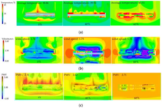 Effect of side window opening rate on thermal environment. (a) Temperature field; (b) wind speed field; (c) PMV.