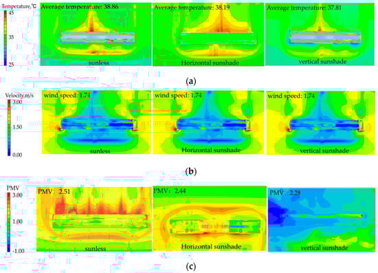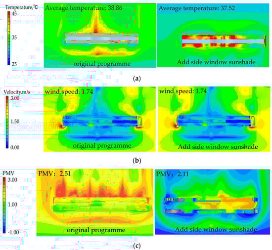 Effect of side window shading on thermal environment. (a) Temperature field; (b) wind speed field; (c) PMV.