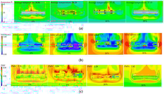 Figure 9 presents the simulation results of the temperature field, wind speed field, and PMV at different side window opening rates. A higher side window opening rate leads to a lower indoor temperature in the station during the summer. At a 20% side window opening rate, the average temperature inside the station can be reduced by 1.7 °C. Further increasing the side window opening rate cannot reduce the temperature effectively but increases the costs. Therefore, a 20% side window opening rate was suggested.
