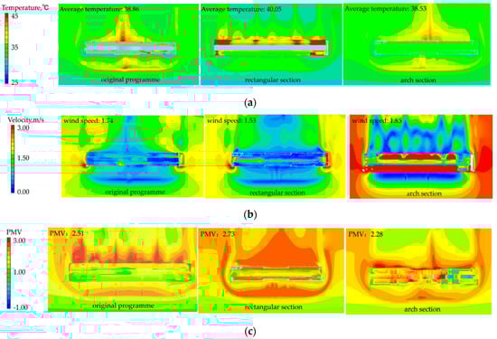 Effect of cross-section shape on thermal environment. (a) Temperature field; (b) wind speed field; (c) PMV.