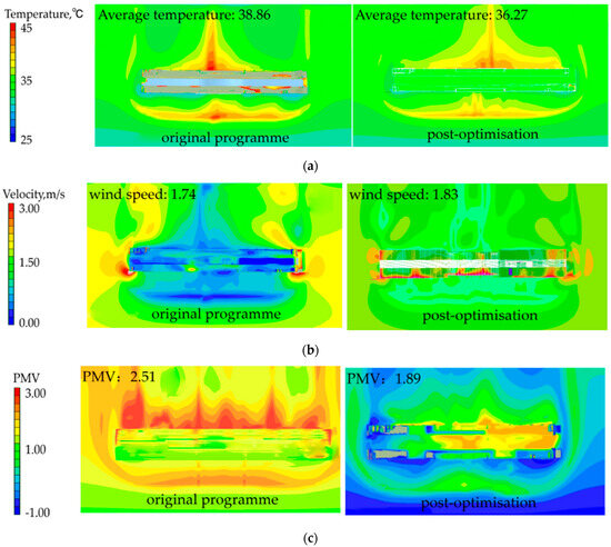 Thermal environment of Wudaokou Station before and after optimization. (a) Temperature field; (b) wind speed field; (c) PMV.