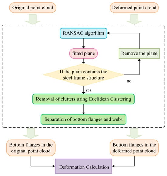 Figure 3. The proposed method involves four main steps. First, RANSAC is applied to the entire point cloud to coarsely extract the steel frame structure through plane fitting. This process is iterated until a plane fitting the steel frame structure is identified. However, the point clouds extracted by this plane still contain many clutter points, as RANSAC includes all points that fit within a specified threshold. Second, Euclidean clustering is applied to segregate the point clouds within the fitted plane into clusters representing the steel frame structure and clusters of clutter, removing the latter. This clustering is done at two scales: globally on the initial RANSAC planes and locally on subsets to preserve detailed features. Third, the bottom flanges and webs of the beams are distinguished based on their orientation and vertical position. This step finalizes the extraction of the bottom flanges. Finally, the extracted bottom flanges are compared between the two epochs to determine the vertical deformations of the beams.