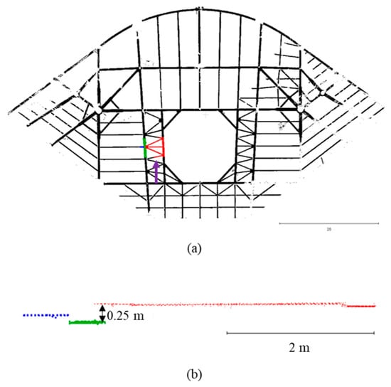 Figure 2b) was also unloaded, the steel frame structure above is near other vertical supports, including loaded temporary lattice columns, concrete-filled steel tube columns, and the main reinforced concrete structure. Consequently, minimal deformation is observed at column