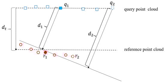 Figure 18. The point cloud of the beam bottom flanges acquired in the second scan is treated as the query point cloud, while the point cloud acquired in the first scan is treated as the reference point cloud. The query point cloud and reference point cloud are represented by rectangles and circles, respectively. The two dashed lines represent the assumed true position of the beam bottom flanges at two epochs, respectively. For a point,