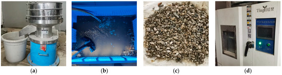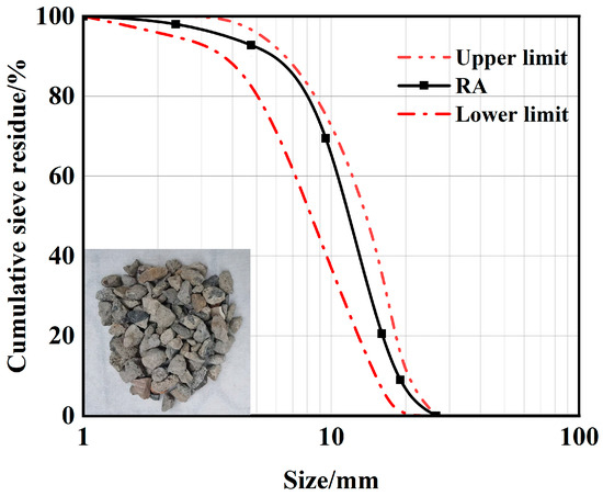 Recycled aggregate was used in the test, which was obtained from the waste concrete of a commercial mixing station after crushing and air-selecting treatment. A 20 mm sieve was used to screen out any large particles, and RA with particle sizes ranging from 5 to 20 mm was obtained after cleaning. The screening and cleaning process of RA is shown in Figure 1. The properties of RA used in this study were determined according to GB/T 14685-2022 [21], and the water absorption rate of RA was measured to be 9.1%, and the apparent density was 2650 kg/m3. The grading curve of RA is shown in Figure 2.