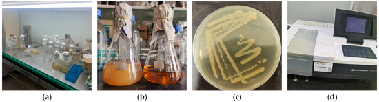 The micro-organisms were activated, and one ultra-pure water was used as the solvent to configure the proliferation medium. The medium was autoclaved at 121 °C (100 kPa pressure) for 20 min according to the Chinese standard GB/T 15981-2021 [22], so that all bacteria and spores were killed and a completely sterile medium was obtained, and Bacillus pasteurii was inoculated in the sterilized liquid medium. It was incubated in a constant temperature shaking chamber for 24 h to obtain sufficient bacterial growth. After 24 h, the bacterial concentration was determined by spectrophotometer using uninoculated enrichment medium as a control. The bacterial solution and medium are shown in Figure 3.