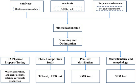 To avoid these disadvantages, many environmentally friendly methods have been proposed. Microbial mineralization deposition technology, in particular, has found application in the construction sector as a sustainable and eco-friendly approach. This biomineralization process offers benefits such as ease of control, user-friendly operation, high mineralization efficiency, and the production of environmentally friendly, non-polluting products that exhibit excellent ecological compatibility [17]. It has also demonstrated promising application potential in engineering practice. Furthermore, building upon carbonate precipitation technology, several researchers have explored the use of micro-organisms to enhance the properties of recycled aggregates (RAs). Qiu et al. [18], Grabiec et al. [19], and Wang et al. [20] have investigated the impact of microbial carbonate precipitation (MICP) on the modification of RAs, affirming the feasibility and efficacy of microbial modification. However, current research lacks in-depth investigation into achieving profound mineralization of RA and significantly enhancing its physical properties. Therefore, a systematic inquiry into the mineralization effects of RA under varying process parameters is required. By optimizing these parameters, the efficiency of MICP technology can be enhanced, the consumption of energy and resources can be decreased, thereby reducing costs and rendering MICP technology more cost-effective, which in turn boosts its competitiveness within the construction industry.