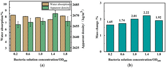 Effects of different bacterial solution concentrations on RA physical properties and calcium carbonate production: (a) water absorption and apparent density; (b) mass change.