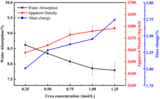 Figure 8 exhibits the trend of the effect of different urea concentrations on water absorption and apparent density of RAs under microbial mineralization treatment. The results showed that urea concentrations of 0.25, 0.50, 0.75, 1.00, and 1.25 reduced the water absorption of RA by 5.29%, 8.34%, 11.23%, 13.68%, and 14.36%, respectively, compared to untreated RA. The data indicated that the modification effect of microbial mineralization treatment on water absorption of RAs increased with increasing urea concentration at urea concentration less than 1.0 mol/L. However, when the urea concentration increased from 1.0 mol/L to 1.25 mol/L, the growth rate of water absorption rate slowed down, and the overall trend showed an increase and then stabilization. For apparent density, the modification effect of urea concentration showed a similar pattern, i.e., with the increase in urea concentration, the modification effect of microbial mineralization treatment on the apparent density of RAs firstly increased and then stabilized. Compared with the untreated RA, the apparent density of the RA increased by 0.29%, 0.53%, 0.86%, 0.98%, and 1.07% when the urea concentration was 0.25 mol/L, 0.50 mol/L, 0.75 mol/L, 1.00 mol/L, and 1.2 mol/L, respectively. In addition, CaCO3 production increased with increasing urea concentration, reaching a maximum at a urea concentration of 1.25 mol/L, at which time the mass of RA increased by 2.76%.