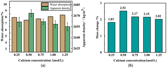 Effects of different Ca+ concentrations on physical properties and calcium carbonate production of RA: (a) water absorption and apparent density; (b) mass change.