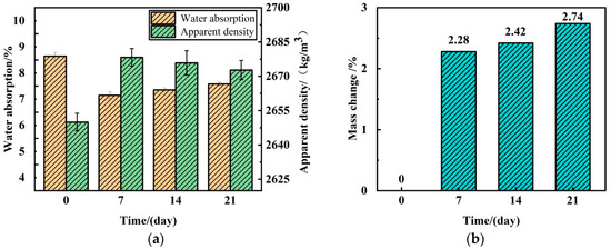 Effects of different mineralization times on RA physical properties and calcium carbonate production: (a) water absorption and apparent density; (b) mass change.