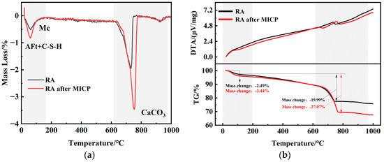 The TG results of RA before and after mineralization are shown in Figure 11. Calcium carbonate thermally decomposes into calcium oxide and carbon dioxide in the temperature range of 650–800 °C [40], and thus CaCO3 can be identified from the characteristic heat-absorbing peaks in Figure 10. In addition, significant exothermic peaks were observed in the temperature interval of 35–200 °C, corresponding to the removal of bound water in C-S-H gels and AFt as well as in Mc, respectively. In the temperature range of 650–800 °C, the weight loss rate of RA is 19.99%, while the weight loss rate of treated RA is 27.07%. Based on the weight loss rate within the decomposition temperature range of CaCO3, the content of CaCO3 can be calculated. The CaCO3 content in the RA group is 45.46%, and after MICP mineralization, the CaCO3 content in the RA group increased to 61.56%. The significant increase in CaCO3 content indicates that a large amount of CaCO3 was generated in the RA after mineralization treatment. Furthermore, thermogravimetric analysis revealed that the decomposition temperature of biogenic calcite is higher than that of chemical calcite intrinsic to RA, indicating that, besides chemical bonds, another special bond must be broken. Qian et al. [41] suggested through a series of studies that this is due to the formation of hydrogen bonds between hydroxyl groups and oxygen atoms in the polypeptides of the biogenic calcite’s organic matter. This also demonstrates the advantage of MICP mineralization treatment for RA and explains the improvement in RA’s physical properties.