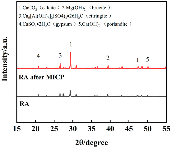 In order to further confirm the physical phase changes of RA after mineralization, XRD analysis was performed. Figure 12 illustrates the X-ray diffractograms of MICP before and after mineralization, which were mainly used to qualitatively detect their mineral composition. Calcite and calcite are the two most common crystalline forms of CaCO3 [40], with calcite being the most stable crystalline form. From the Figure 12, it can be seen that the characteristic peaks are mainly distributed near 29° for calcite crystal diffraction peaks, in addition to a small amount of calcite alumina, hydromagnesite, and hydroxycalcite. Specifically, the area of the peaks indicates the crystal content, and the larger the area of the peaks, the higher the crystal phase content. Under the treatment of MICP, the diffraction peaks of calcite-type CaCO3 become stronger and stronger, which confirms the generation of calcium carbonate on the surface of RA.