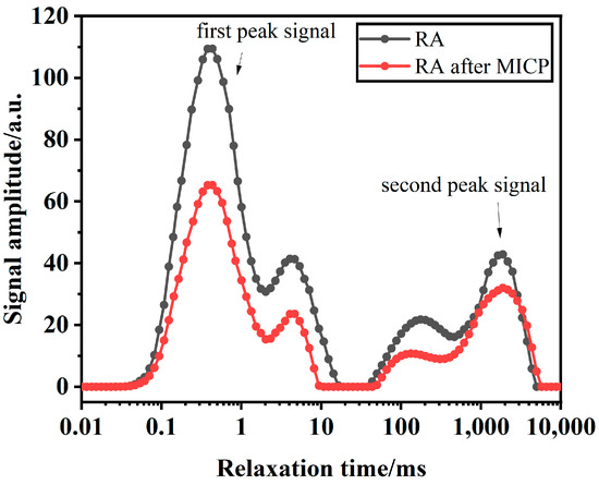 When the porous medium is in a saturated state, T2 is proportional to S/V and can be used as a measure of pore size. Therefore, the inverted T2 spectrum reflects the pore size distribution curve of the sample. Due to layout limitations, this study compares the RA with the best MICP treatment effect and the untreated RA, and the inversion results are shown in Figure 13. The inverted graph after the NMR test was processed, and the results were compared and analyzed. By comparing the changes in the T2 relaxation peaks of the NMR test spectra before and after MICP treatment (including the range of relaxation times, the peak maxima, and the changes in peak areas), and combining these with the amount of CaCO3 deposited on the RA surface, the effect of MICP treatment on the changes in RA porosity and its impact on physical properties was determined.