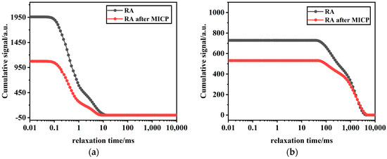 NMR integrals of RA before and after MICP mineralization: (a) integration of the amplitude of the first peak signal; (b) integration of the amplitude of the second peak signal.