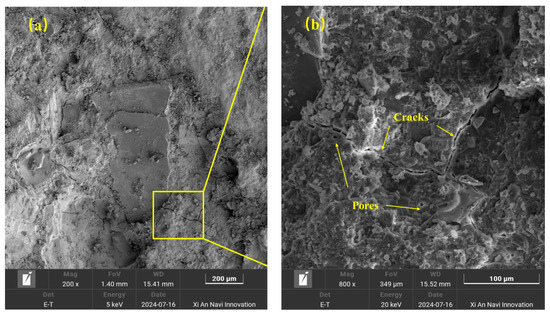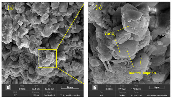 SEM image of RA after MICP treatment: (a) magnification 3000×; (b) magnification 10,000×.