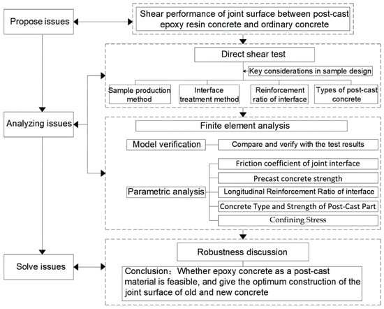 In summary, this paper advocates for the utilization of epoxy resin concrete as a post-cast material within assembled monolithic structures, focusing on the bond between aged and fresh concrete surfaces. Employing both experimental approaches and finite element analysis, this research aims to evaluate how different elements affect the shear performance of these concrete junctions. These elements encompass post-cast concrete strength class, friction coefficient of interface, confining stress, the longitudinal reinforcement ratio of interface, and the strength class of pre-cast concrete. The objective is to assess the shear behavior of the junction between post-cast epoxy resin concrete and standard concrete, thereby providing empirical data to support the use and advancement of epoxy resin concrete in assembled monolithic concrete frameworks. The research methodology and steps of this paper are depicted in Figure 1.
