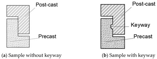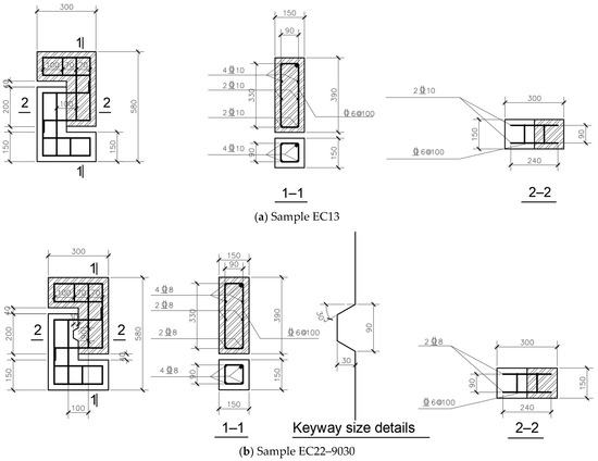 The basic composition of the assembled direct shear sample is depicted in Figure 2. Keyway extends horizontally across the entire interface, with the dimensions of the interface measuring b × h = 150 mm × 200 mm. Longitudinal reinforcement passes through the interface and is reliably anchored within both the pre-cast and post-cast parts, respectively. Detailed specifications concerning the dimensions and reinforcement layout of typical samples are illustrated in Figure 3.