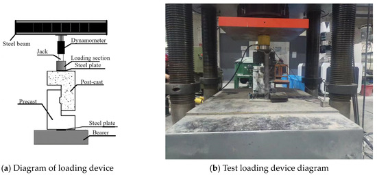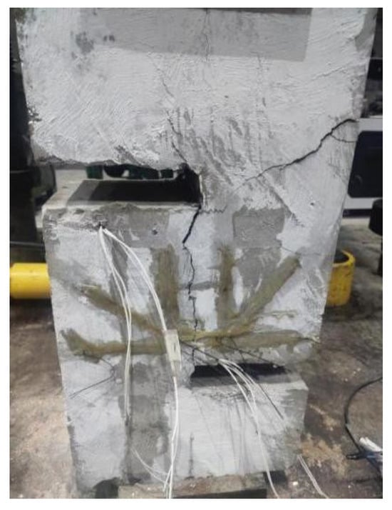 The configuration of the direct shear test apparatus is depicted in Figure 4. The loading equipment was 50 t hydraulic jack, while the steel beam of a 2000 t electro-hydraulic servo universal testing machine served as the vertical load counter frame. A transducer was placed above the jack to monitor loading metrics. To distribute the vertical load effectively, a 150 mm × 200 mm steel plate was located at the middle of both the top and bottom surfaces of the sample. This setup ensured that the central force applied during testing aligned with the shear surface (the interface of the aged and the fresh concrete), facilitating a pure shear condition. Initially, the sample underwent preloading to 30% of the anticipated cracking load, and the test was repeated several times to ensure uniform force application and the proper functioning of the loading apparatus. In the main loading phase, incremental loads of 10 kN were applied in a force-controlled manner until sample failure occurred.