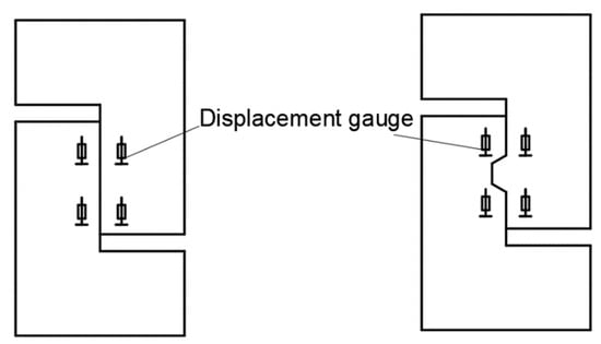 The experimental protocol necessitated measuring the relative slip at the bonding surface between the two sides of the bonding surface throughout the loading phase. To eliminate the test errors, dual displacement gauges were strategically positioned on each side of the interface. The configuration of these displacement sensors is outlined in Figure 5. The relative slip across the interface was quantified by calculating the difference between the average readings from the displacement gauges on the left and right sides of the joint.