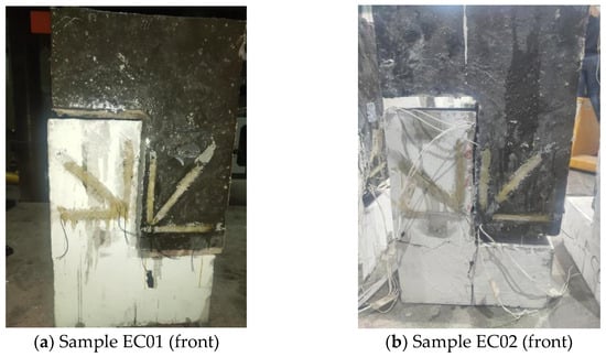 For the unreinforced sample EC01, initially, no apparent damage was observed at the onset of loading. However, upon reaching a load of 53 kN, a sudden “bang” was heard and the sample split along the interface, separating the pre-cast from the post-cast parts. This led to a sharp decline in the bearing capacity, leading to the sample’s failure. Apart from minor concrete spalling on one side of the prefabricated section, the rest of the sample exhibited significant damage, with a flat shear damage surface. This damage is depicted in Figure 7a as typical shear damage.