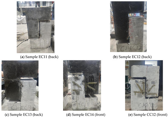 The damage patterns of unreinforced samples EC11 and EC01 of post-cast epoxy resin concrete were similar, exhibiting typical shear damage (Figure 8a). Notably, the shear capacity of the former was slightly greater than that of the latter, indicating a favorable effect of the roughness of the interface on shear performance. Conversely, compared with EC11, the unreinforced samples of post-cast ordinary concrete CC11 sustained damage before formal loading, highlighting the extremely low shear capacity of the interface between the post-cast plain concrete and the pre-cast section.