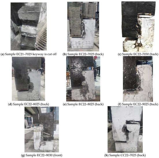 The damage process of sample CC22–7025 was similar to those of the six reinforced samples in the EC22 group, although it exhibited a lower ultimate load. During the damage phase, the keyway sheared, as illustrated in Figure 9h.