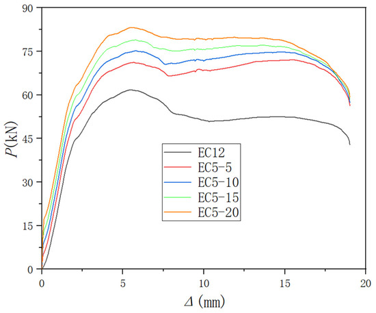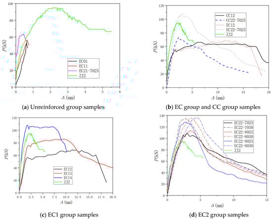 The test phenomena of samples of the EC1 group (EC12~EC14) and EC02 samples showed similar damage patterns, predominantly occurring at the bond surface. With the increasing reinforcement ratio, both the cracking load and ultimate bearing capacity of the samples increased, while the corresponding displacement decreased. For samples EC13 and EC14, the concrete shielding layer at the upper part of the interface spalled off due to the action of longitudinal reinforcement pins. The damage patterns of these samples are depicted in Figure 8b–d.