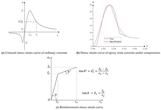 Concrete was modeled using a plastic damage model. For ordinary concrete, the constitutive equation aligned with the uniaxial stress–strain curve specified in the Code for the Design of Concrete Structures (GB 50010-2010) [27], as illustrated in Figure 11a. Epoxy resin concrete utilized the plastic damage model for concrete, with its constitutive relationship based on the comprehensive curve equation for compressive stress–strain fitted by the research group according to the test and specification [13]. This is de-tailed in Equation (1), The compressive stress–strain curve is displayed in Figure 10b. For the tensile stress–strain curve, epoxy resin concrete refers to that of ordinary concrete, adopting the same constitutive model. The stress–strain curves for the reinforcement were modeled using a bifold model, as depicted in Figure 10c. Table 6 presents the principal parameters of plastic damage for both plain and epoxy resin concrete.