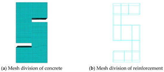 In the models, both epoxy resin concrete and ordinary concrete were represented using C3D8R elements and T3D2 elements. The steel reinforcement was treated as fully embedded within the concrete, disregarding any bonding effects with the concrete. The meshing was conducted using a structured division method, with the cell meshing size set to 11 mm for both old and new concrete and to 15 mm for steel reinforcement cells, as depicted in Figure 12. The interface between fresh-aged concrete was modeled using a contact approach that directly considered the interaction between the two surfaces, and the Coulomb friction model was utilized to simulate the bonding effect at the interface. According to the provisions of both U.S. specifications [28] and the provisions of the EU specifications [29], the coefficient of friction μ should be taken as 1.0 for hardened concrete surfaces that are clean, free of slurry, and roughened to a concave and convex depth of at least 1/4 inches. For contact surfaces of rolled structural steel with shear pins or reinforcement, the coefficient of friction μ is set at 0.7. For contact surfaces that are roughened and have a roughness of ≥1.5 mm, the coefficient of friction μ ranges from 0.7 to 1.0. Following several trial computations, the friction coefficient of the joint surface between epoxy resin concrete and ordinary concrete was determined to be 0.8. For models incorporating keyways on the interfaces, the normal action was designated as “hard contact”, which implies there is no limitation to the amount of pressure that can be transferred across the contact surfaces. When the contact pressure becomes negative, indicating the initiation of separation between the two surfaces, the contact constraints at the joints are released. In contrast, models without keyways in the joint feature “soft contact” for normal actions, set as “table”, allowing for some degree of penetration between the two surfaces. This setting is particularly effective for simulating the interactions between old and new concrete, permitting penetration with a displacement of 0.01 mm when the pressure reaches 10 kN.