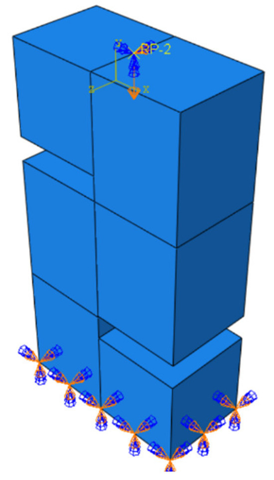 Boundary conditions of the model mirrored the boundary settings employed in the experimental setup, with the sample’s bottom designated as a fixed constraint. A reference point was set at the midpoint of the top of the sample for coupling purposes, and displacement loading was carried out at this reference point to prevent the stress concentration in the loading beam during the loading process. The analysis was carried out in two stages. In the first stage, the translation in the Z direction and the rotational degrees of freedom in the X, Y, and Z directions at the reference point were restricted. In the second stage, a downward displacement of 19 mm was applied at the reference point. The loading system was a replica of that which was used in the test. Figure 13 illustrates the boundary conditions and loading methods under the finite element model.