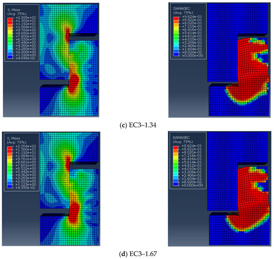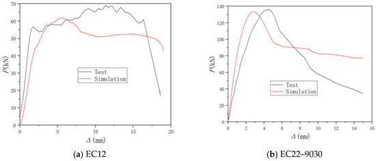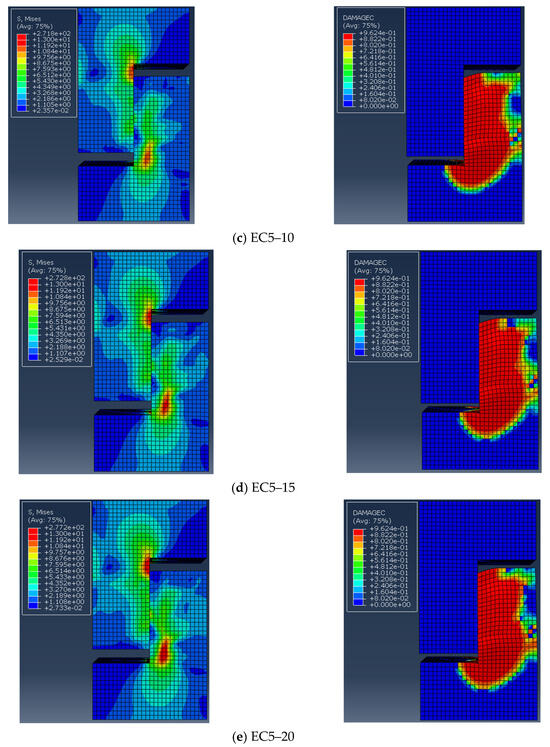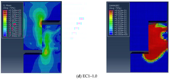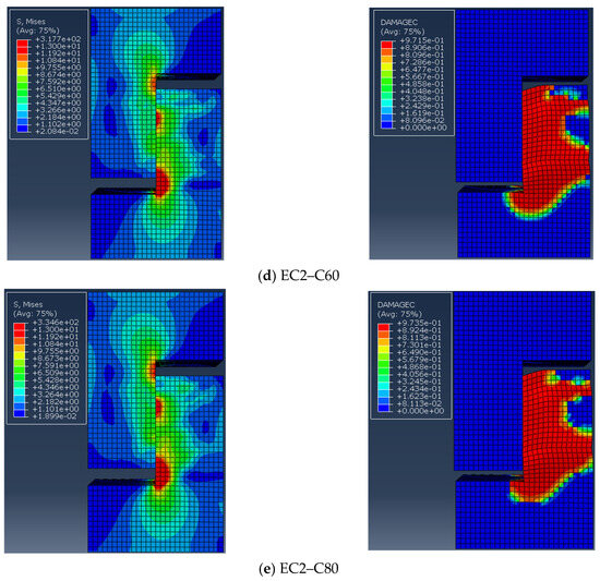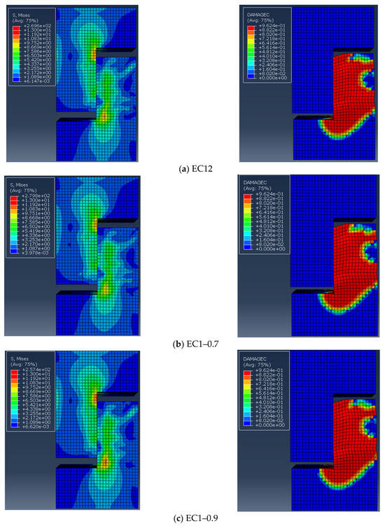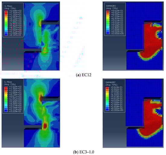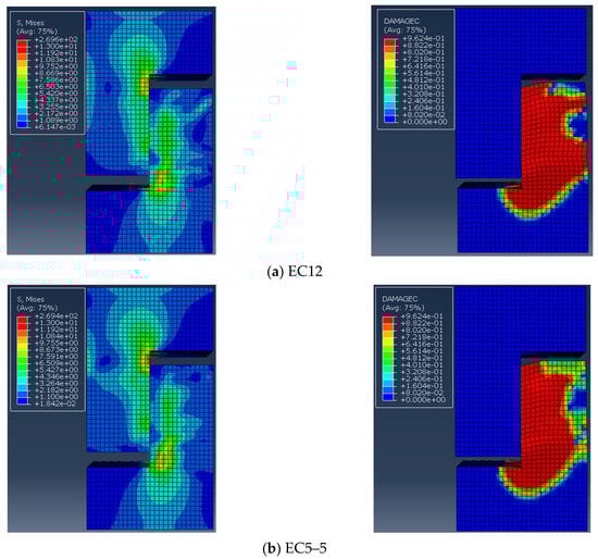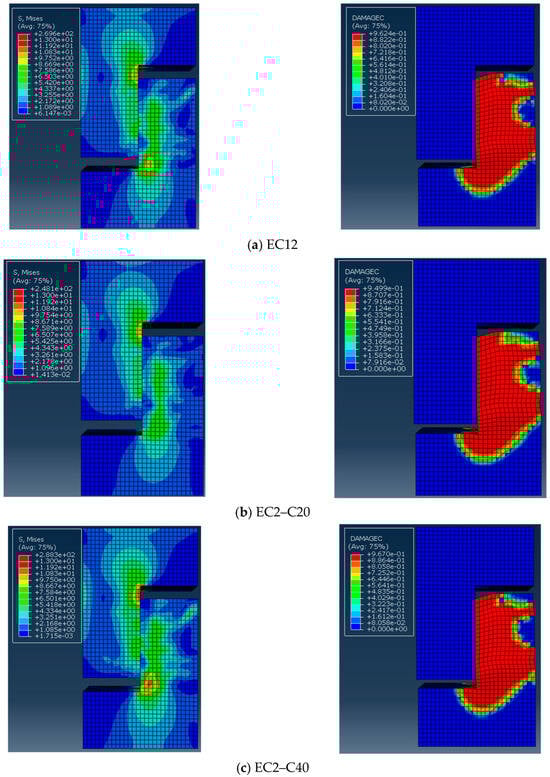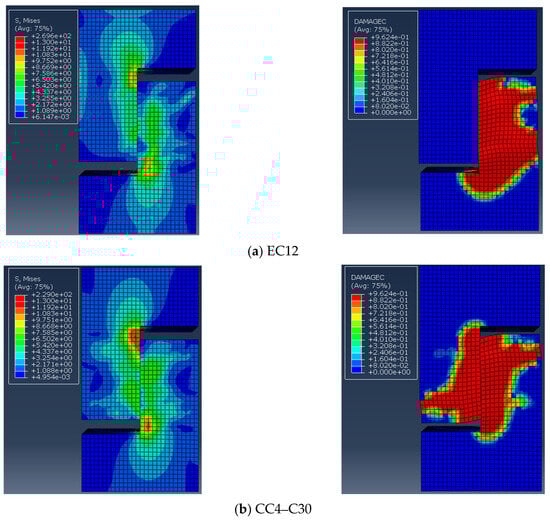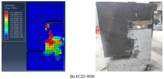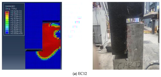 Samples EC12 and EC22–9030 were selected to confirm the precision of the finite element model. The distribution of the damage factor for concrete under compression served as a proxy for actual sample damage, which is depicted in Figure 14. Figure 14a indicates that the damage to sample EC12 was mainly concentrated in the ordinary concrete on the right side of the lower part of the concrete, which is basically in line with experimental observations. Similarly, as shown in Figure 14b, damage to sample EC22–9030 was primarily concentrated at the upper and lower sides of the keyway, with notable crushing of the concrete below the keyway, closely matching the test results.