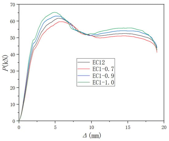 Figure 16 shows the stress cloud diagram for the samples with varying friction coefficients at the peak load, as well as the damage factor distribution diagram at the end of the test. It is evident that the friction coefficient had a slight influence on the failure mode of the samples. The peak stress of the samples appeared at the interface of the fresh-aged concrete. The post-cast part made a major contribution to the stress of the samples, and the damage was primarily localized in the upper part of the pre-cast concrete. Figure 17 presents the P-Δ curves of each sample. It can be observed that, with the rise in the friction coefficient, the initial stiffness of the interface increased slightly. After entering the plastic stress stage, the friction coefficient had a clearer effect on the sample’s load-bearing capacity as the friction coefficient rose from 0.7 to 0.8, and the sample’s load-bearing capacity rose from 59.7 to 61.7 kN, with a growth rate of 3.3%. The friction coefficient rose from 0.8 to 0.9, and the load-bearing capacity rose from 61.7 to 63.0 kN, with an increase rate of 2.0%. The load-bearing capacity rose from 63.0 to 65.3 kN, with a growth rate of 3%. The growth rate was 2.0%. From 0.9 to 1.0, the load carrying capacity increased from 63.0 kN to 65.3 kN, with a growth rate of 3.5%. In conclusion, it can be seen that a larger friction coefficient can maintain the shear load capacity and stiffness of the sample to a certain extent, as well as slow down the stiffness degradation.