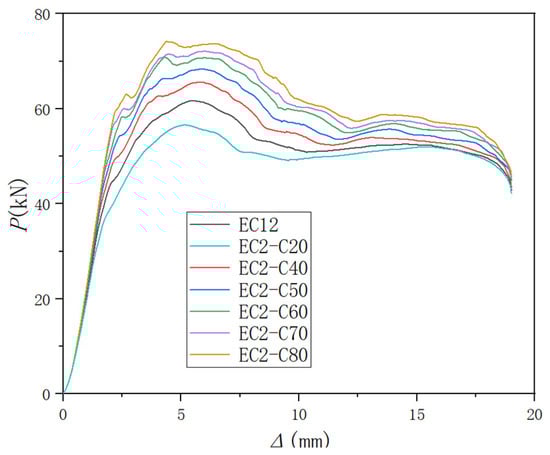 Figure 18 shows the stress cloud diagram and the damage factor distribution diagram at the end of the test for a typical model at peak load. These diagrams illustrate that the strength of the pre-cast concrete does not alter the failure mode of the interface. The peak stress in the sample occurred near the joint between the pre-cast and post-cast parts, with the post-cast section significantly adding to the overall stress. Figure 19 depicts the P-Δ curves of each sample, showing that while the concrete strength had minimal impact on the initial stiffness of the sample, it significantly affected the bearing capacity. As the concrete strength grade increased from C20 to C30, the bearing capacity rose from 56.6 kN to 61.7 kN, an increase of 8.3%. From C30 to C40, the capacity increased from 61.7 kN to 65.7 kN, an increase of 6.1%. From C40 to C50, it escalated from 65.7 kN to 68.4 kN, up by 3.9%. From C50 to C60, it rose from 68.4 kN to 70.7 kN, a rise of 3.3%. From C60 to C70, it increased from 70.7 kN to 72.1 kN, an increase of 1.9%. From C70 to C80, it climbed from 72.1 kN to 73.7 kN, an increase of 2.1%. Subsequently, as the concrete strength continued to increase, the rate of improvement in the sample’s bearing capacity was diminished. Ultimately, the optimal performance of the sample is achieved when the strength of the post-cast epoxy resin concrete was close to or slightly exceeded that of the pre-cast concrete. This is attributed to the optimal interaction capabilities between the fresh and aged concrete at the interface, allowing for the most effective utilization of their combined mechanical properties.