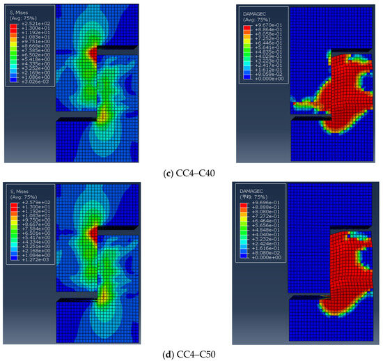 Stress cloud diagram and damage factor distribution diagram of each sample, with various reinforcement ratios.