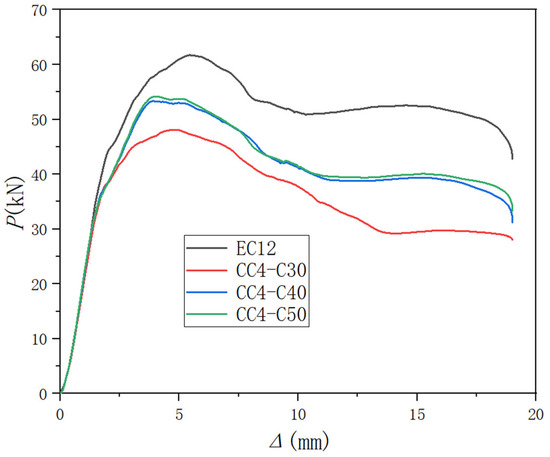 Figure 22 presents the stress cloud diagrams and damage factor distribution diagrams for samples with varying strengths of post-cast ordinary concrete. Meanwhile, Figure 23 showcases the P-Δ curve of each sample. Notably, the damage observed in post-cast ordinary concrete samples is more obvious than in those using post-pouring epoxy resin concrete samples, affecting both old and new concrete. Analysis of Figure 23 reveals that the bearing capacities for samples EC12, CC4-C30, CC4-C40, and CC4-C50 were 61.7 kN, 48.1 kN, 53.0 kN, and 53.7 kN, respectively. Thus, as the strength of post-cast ordinary concrete progressively increased, so too did the bearing capacity of the samples, albeit without reaching the performance levels of samples that utilized epoxy resin concrete as the post-cast material. This outcome underscores the superior performance of epoxy resin materials in the post-cast phase of assembled structures, confirming their effectiveness in enhancing structural integrity and durability.