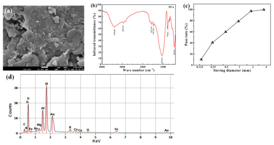 Microstructure of PFA: (a) SEM image; (b) FTIR spectra; (c) particle size distribution curve; and (d) EDS pattern.